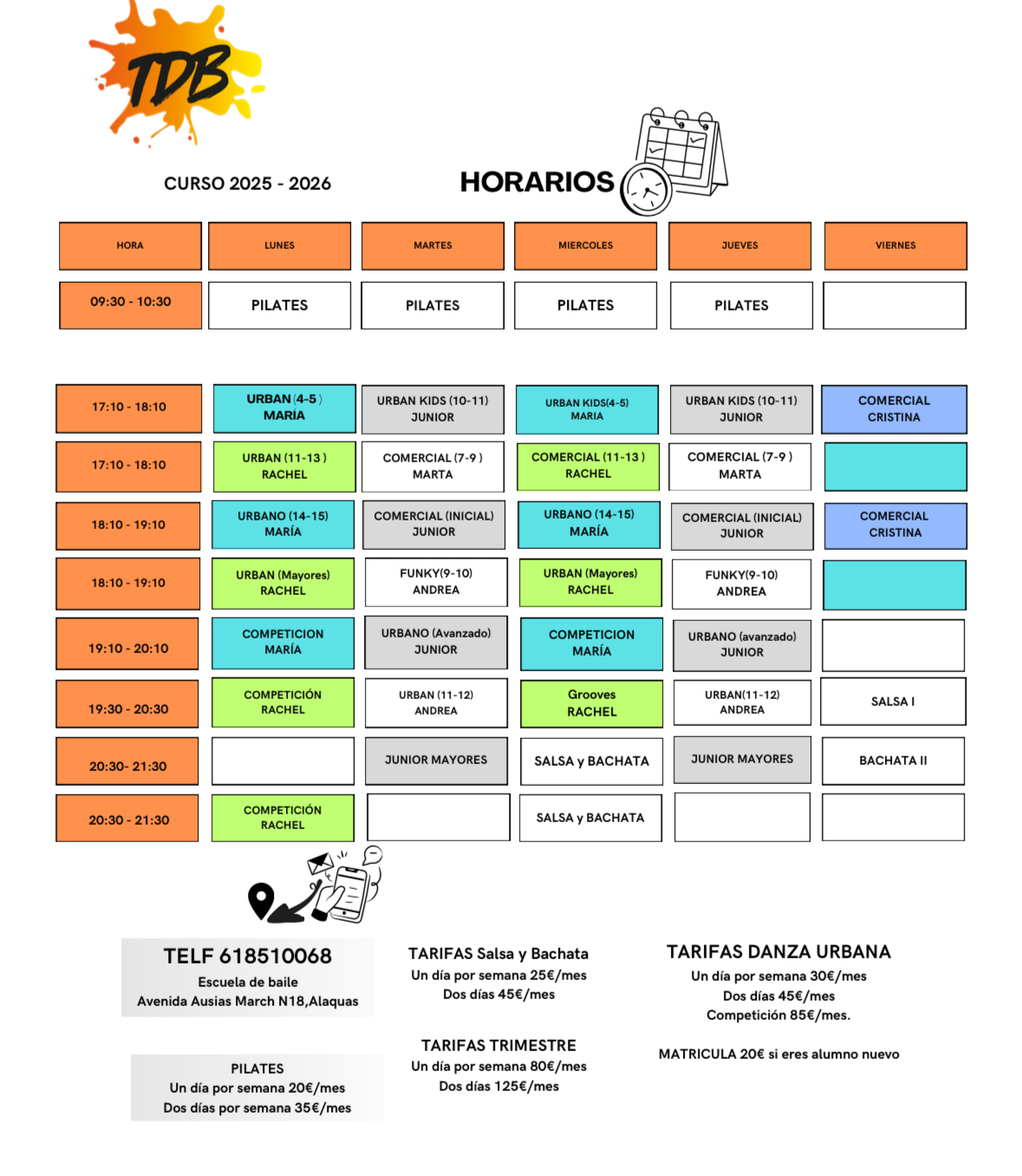 En TDB tenemos una amplia variedad de horarios para que puedas aprender y disfrutar de la danza en el momento que mejor se adapte a tu rutina. Ya sea que prefieras el energético ritmo del hip hop, la elegancia del lírico, o la relajación del yoga, tenemos opciones para todos los niveles y estilos. Consulta nuestros horarios y encuentra el espacio perfecto para comenzar o continuar tu camino en la danza. ¡No esperes más y haz que el baile sea parte de tu vida diaria!